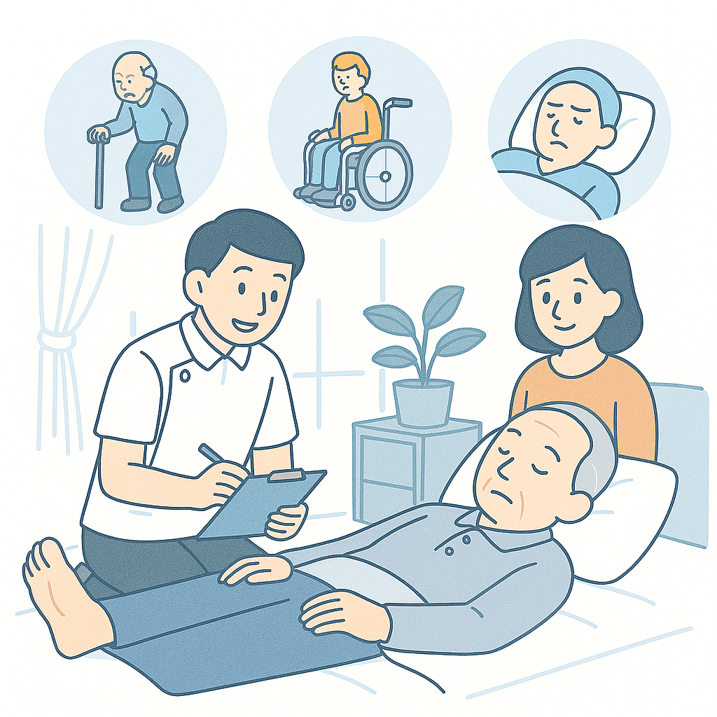 歩くのがつらい、家から出るのが難しい、ひとりで通院できない方が対象です。年齢は関係なく、ケガ・病気の後遺症などで手足が動きにくい方、筋力が落ちて立ち上がりが大変な方、寝たきりで過ごす時間が長い方も利用できます。まずは体の状態を確認し、その方に合った内容で無理なく続けられる方法をご提案します。